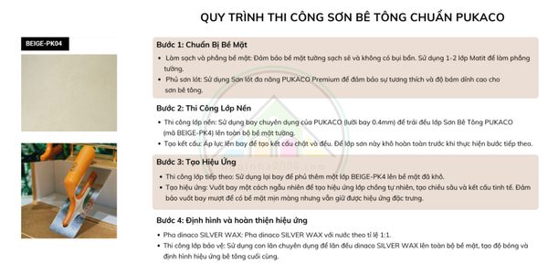 Để đạt được bề mặt hoàn thiện cứng như đá, óng ánh như lụa và bền đẹp theo thời gian, quy trình thi công Sơn Bê Tông Lụa Pukaco cần thực hiện đúng kỹ thuật qua các bước sau: